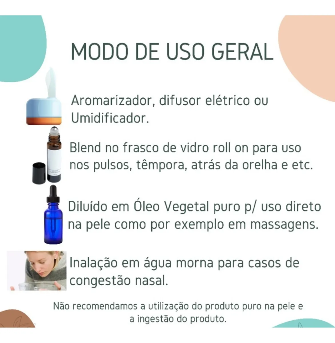Utilize com: Óleo Vegetal, Argila Medicinal, Creme Base Neutro, Gel de Aloe Vera, Aromatizador Pessoal e/ou Difusor de Aromas para o Ambiente.